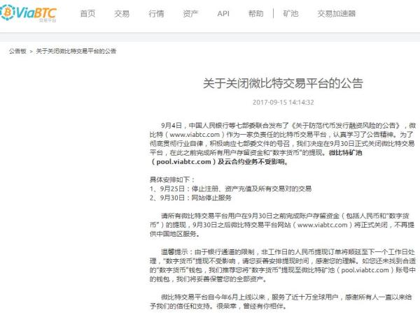 9月4日,中国人民银行等七部委联合发布了《关于防范代币发行融资风险的公告》,微比特(www.viabtc.com)作为一家负责任的比特币交易平台,认真学习了公告精神。为了彻底贯彻行业自律,积极响应七部委文件的号召,我们决定在9月30日正式关闭微比特交易平台,在此之前完成所有用户存留资金和“数字货币”的提现。微比特矿池(pool.viabtc.com)及云合约业务不受影响。CE9小哈网站目录_网站分类目录_网站目录提交_中外网址大全