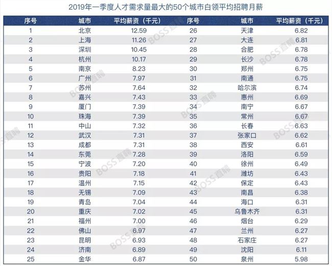 BOSS直聘研究院数据显示, 2019 年Q1二线城市平均招聘薪资为 7364