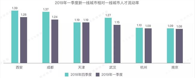 受到更多城市落户政策放宽和人口吸引政策等因素影响,六个新一线城市在 2019 年Q1 的人才净流入率较 2018