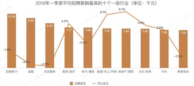 互联网、金融、教育行业的平均招聘薪酬环比分别下降1.9,4. 5 和3. 3